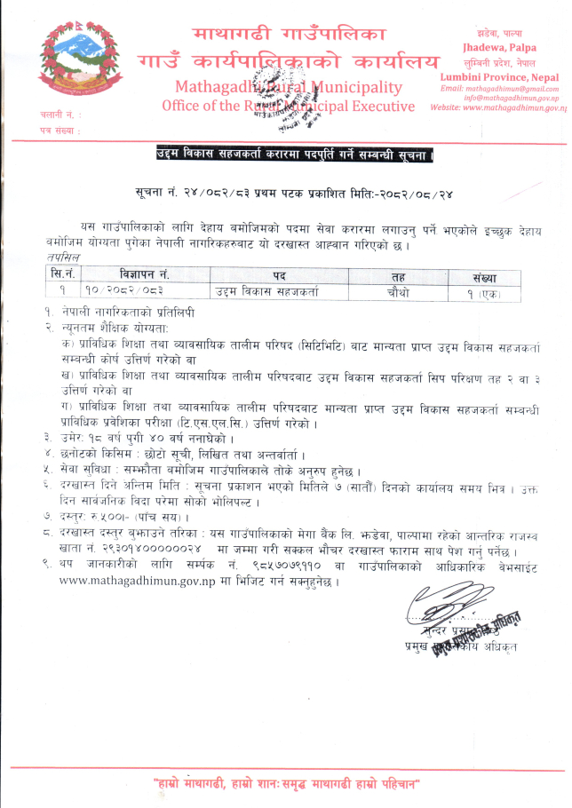 उद्दम विकास सहजकर्ता करारमा पदपुर्ति गर्ने सम्बन्धी सूचना