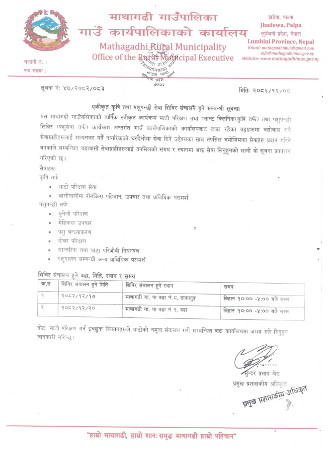 एकीकृत कृषि तथा पशुपन्छी सेवा शिविर संचालन हुने सम्बन्धी सूचना!