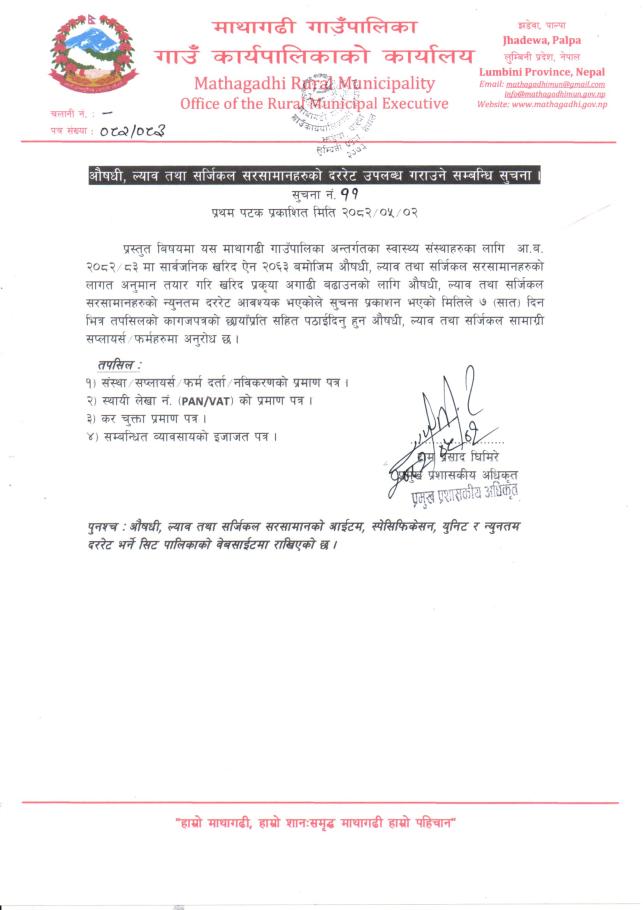 औषधी, ल्याव तथा सर्जिकल सरसामानहरुको दररेट उपलब्ध गराउने सम्बन्धि सुचना ।