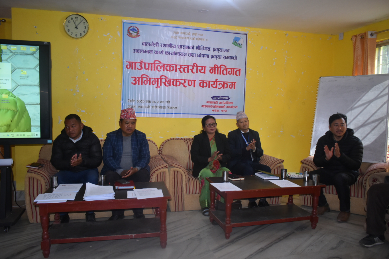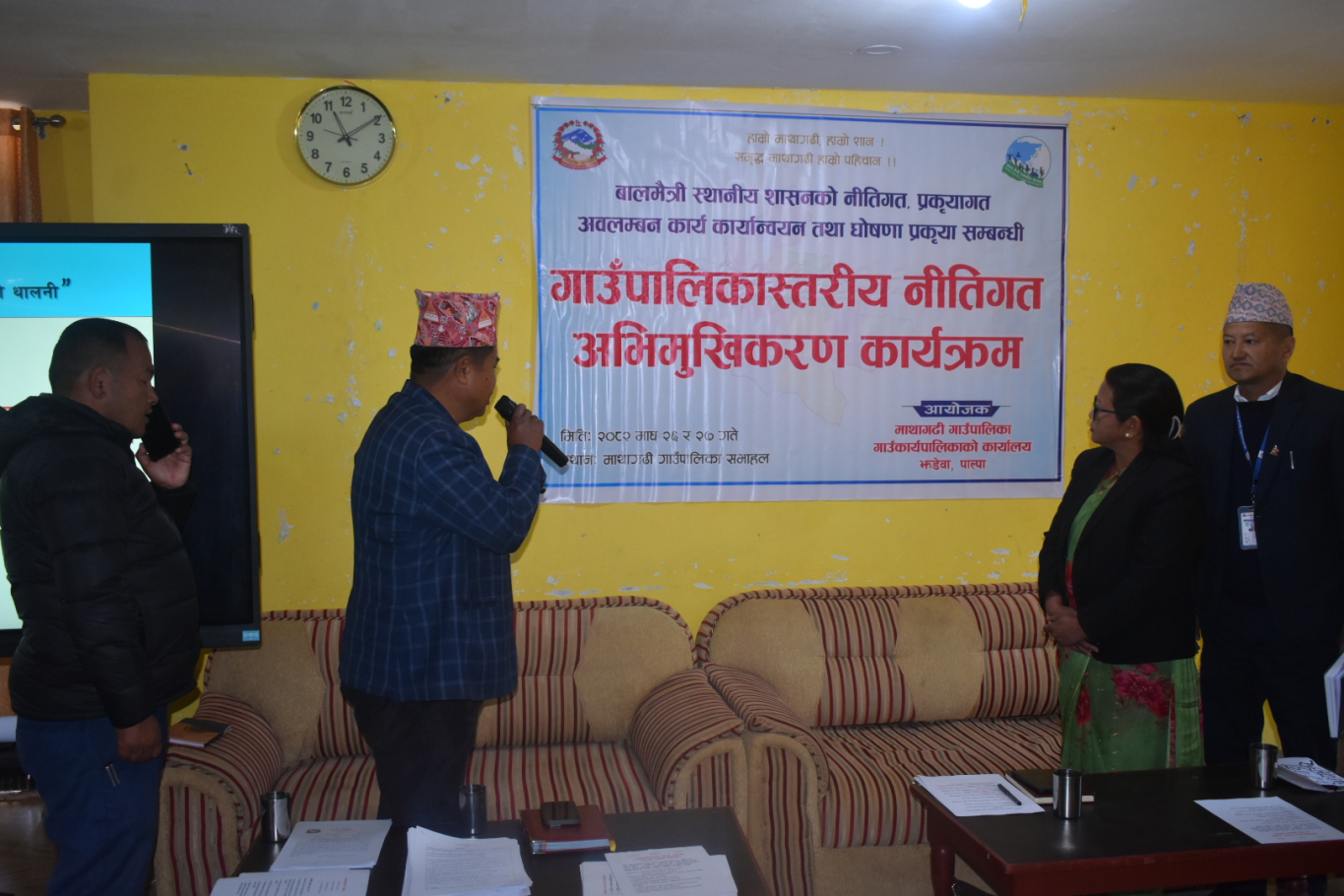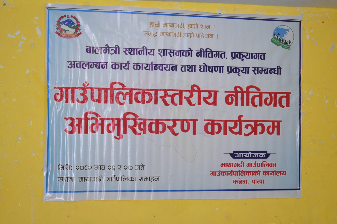 आज मिति २०८२/१०/२६ गते माथागढी गाउँपालिकमा बालमैत्री स्थानीय शासनको नीतिगत, प्रकृयागत अवलम्बन कार्य कार्यान्वयन तथा घोषणा प्रकृया सम्बन्धी गाउँपालिकास्तरीय नीतिगत अभिमुखिकरण कार्यक्रमको पहिलो दिन सक्रियका साथ सम्पन्न भएको छ। उक्त कार्यक्रमका केही झलकहरु
